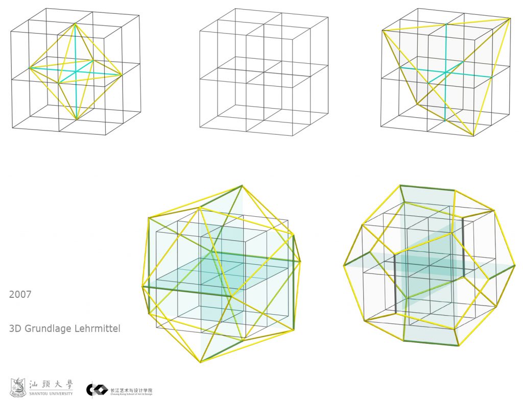 Platonische Koerper 德文柏拉图体的意思,它分别是正三面体,正六面体,正八面体,正十二面体,正二十面体。它们对我设计的启发极为重要。利用黄金分割和正六面体为基础形体推导出其它四个形体,这是一个漫长探索过程。下面展示的是我给CKAD学生教授三维基本原理的教具模型,它们是设计的根本所在。这里我要感谢我在德国的教授,Oliver Niewiadomski先生的尽心指导。